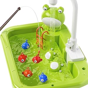 - 2-in-1 Kitchen Sink Playset + Fishing Game: This kids play sink set combines pretend kitchen fun with a floating fishing game. It includes an electric faucet, play food, kitchen accessories, and floating fishing toys—perfect for water play, role-play, and creative imagination.